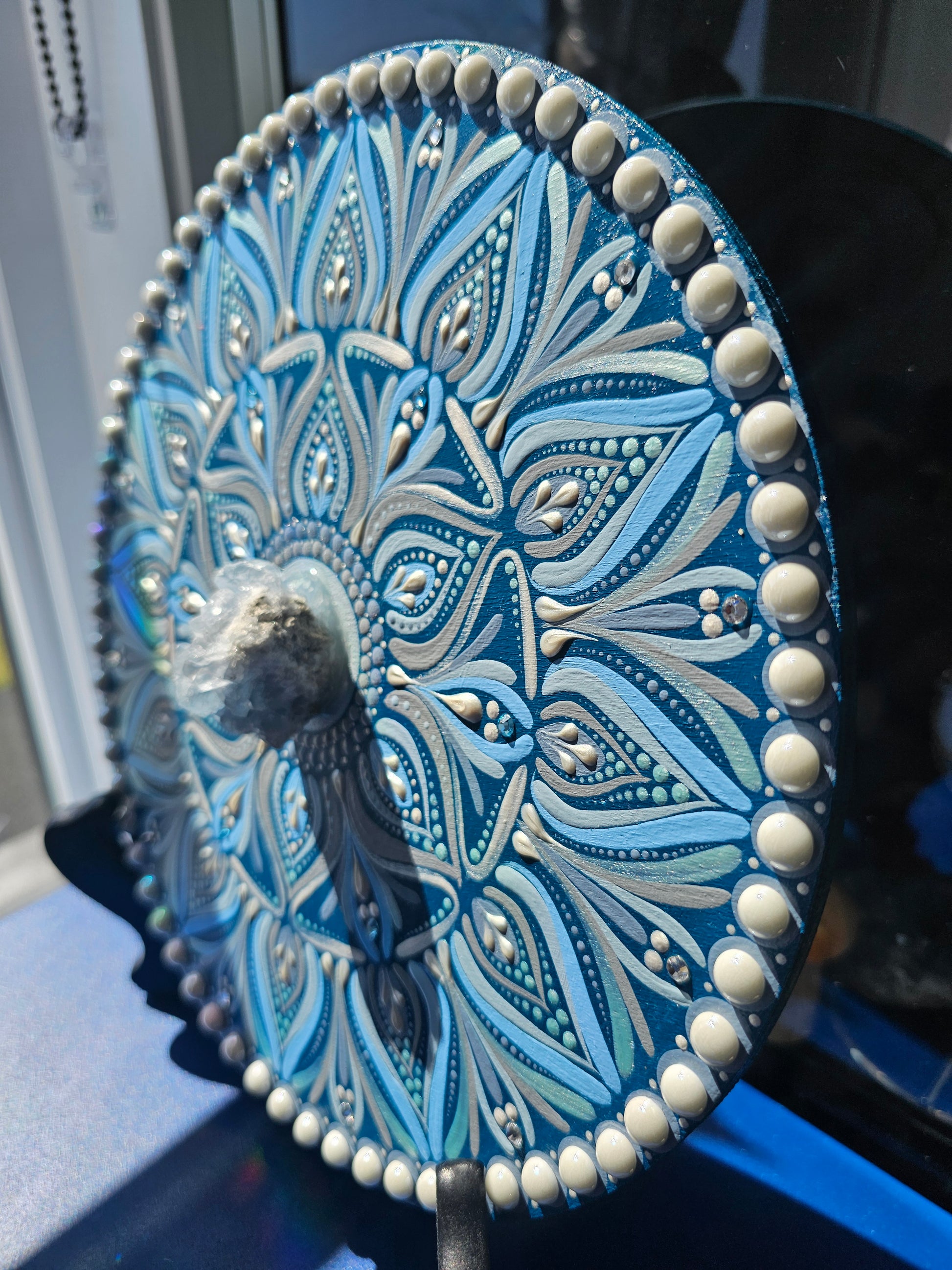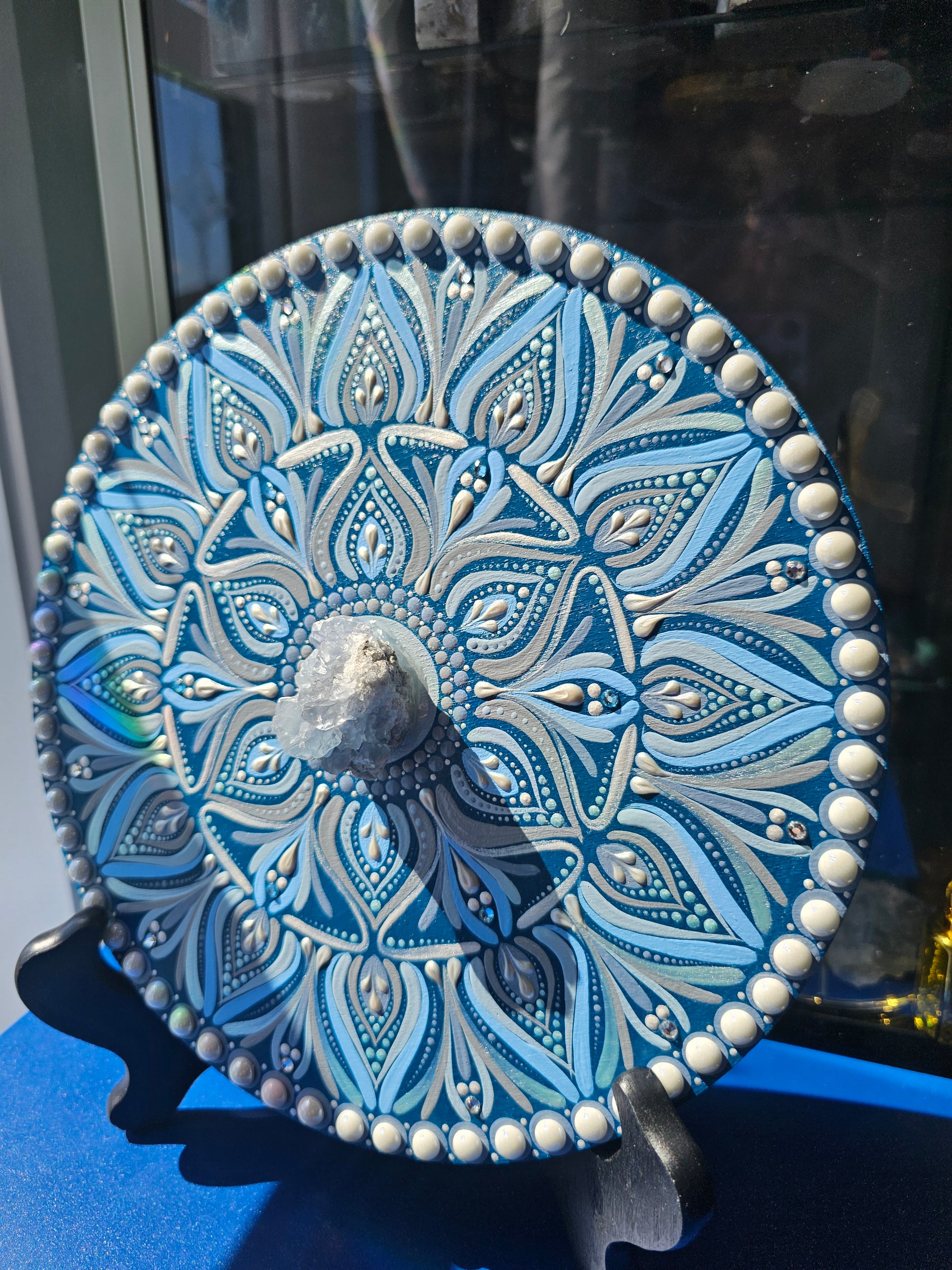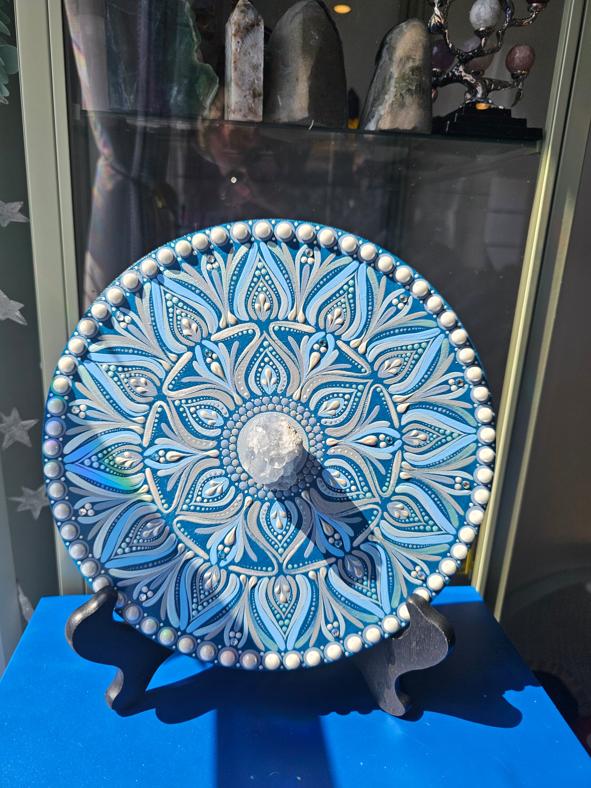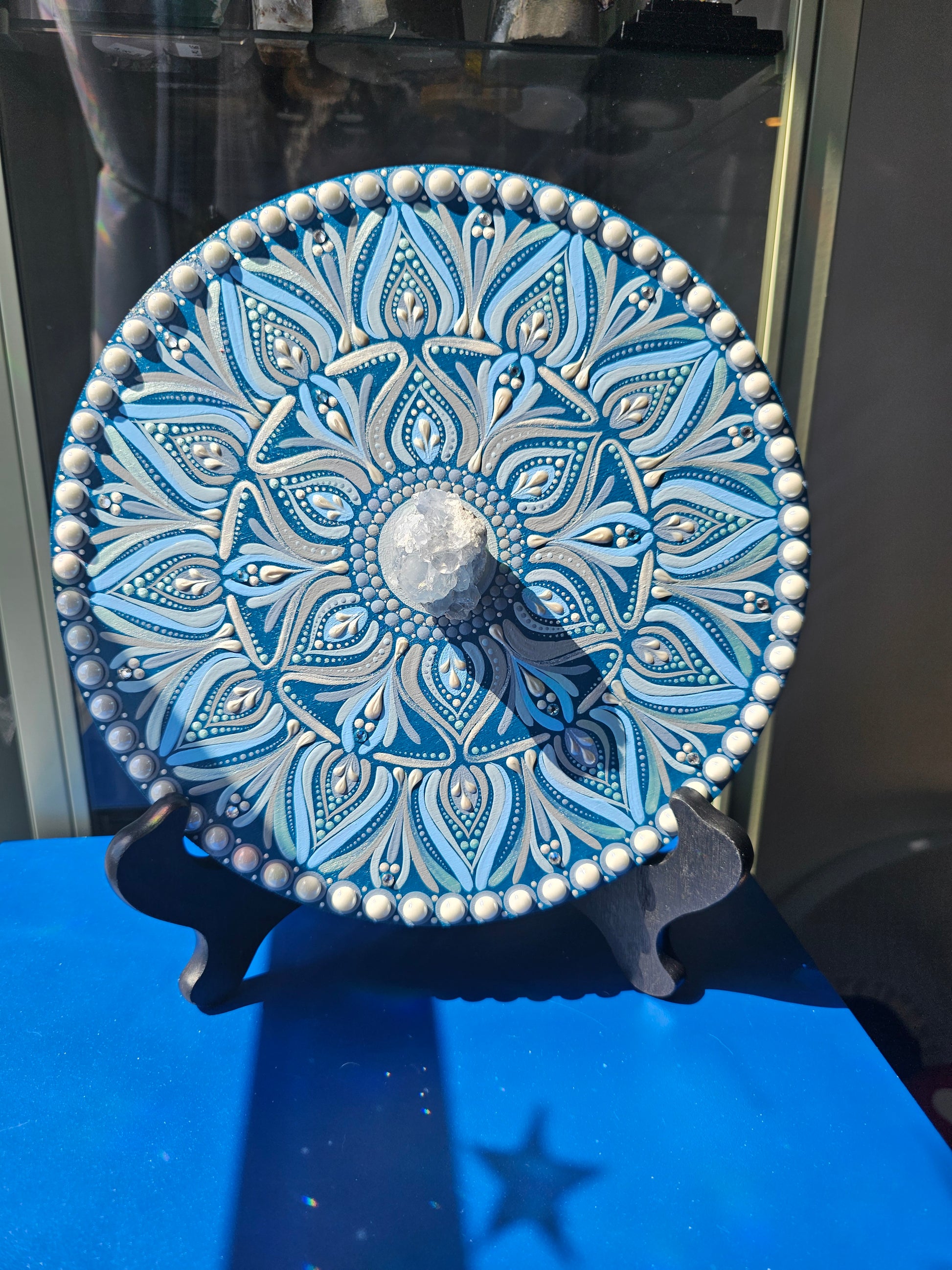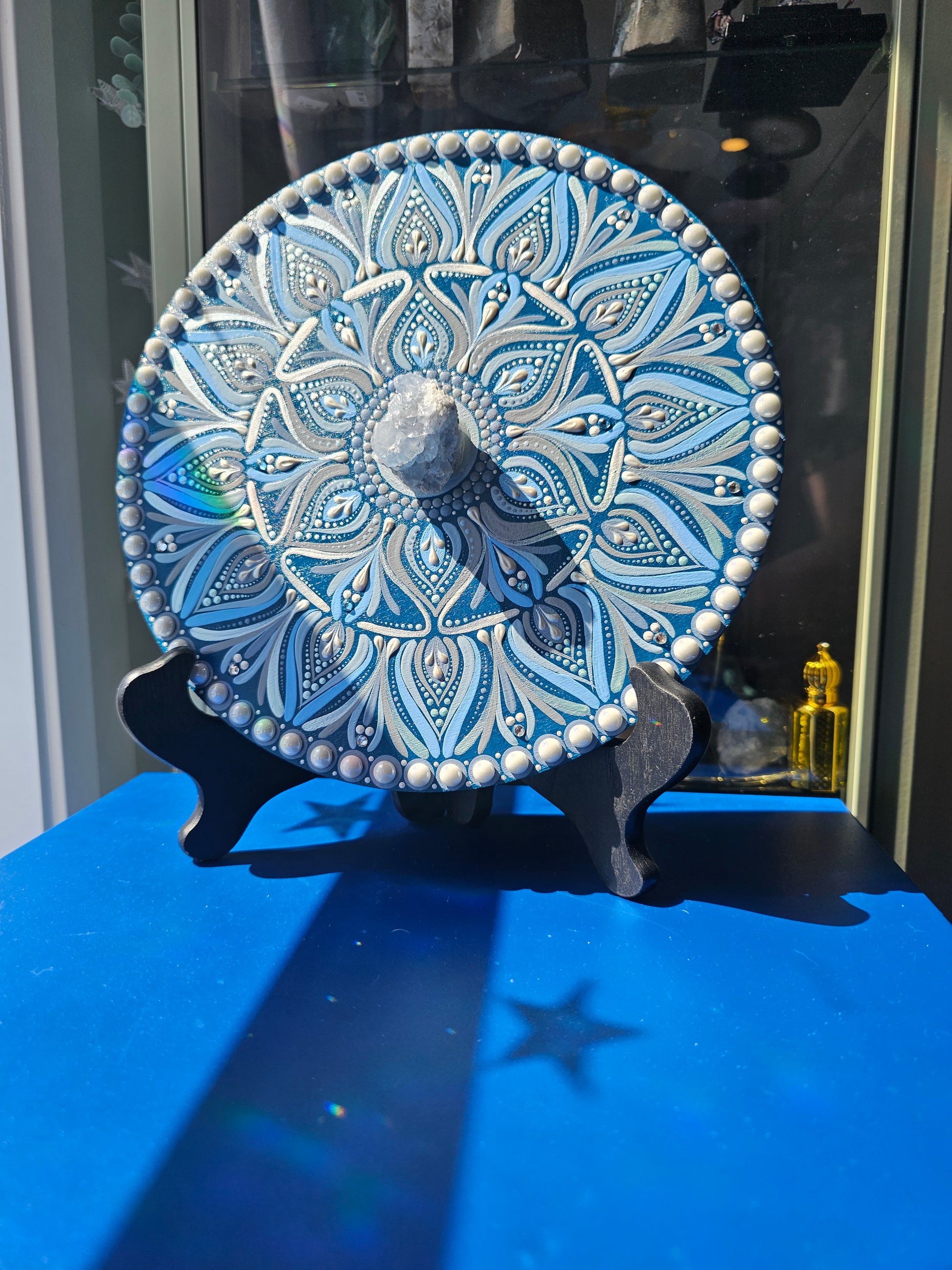 Mandala de 13 pouces sur bois avec son socle en bois.